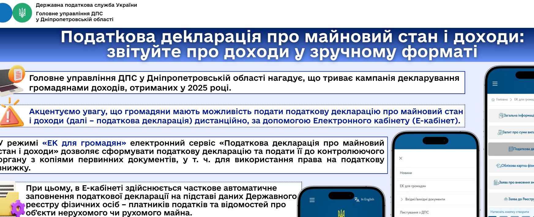 Головне управління ДПС у Дніпропетровській області нагадує, що триває кампанія декларування громадянами доходів, отриманих у 2025 році.