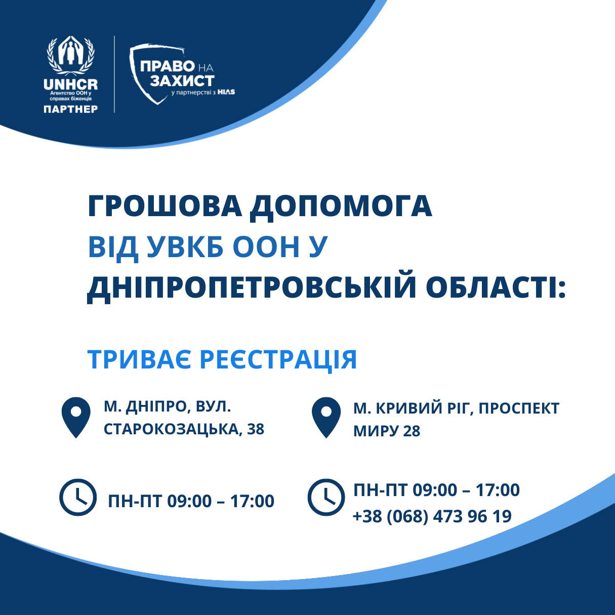 У Дніпрі, Кривому Розі та області триває реєстрація на грошову допомогу від УВКБ ООН в розмірі 6660 грн для родин ВПО та постраждалих від воєнних дій: